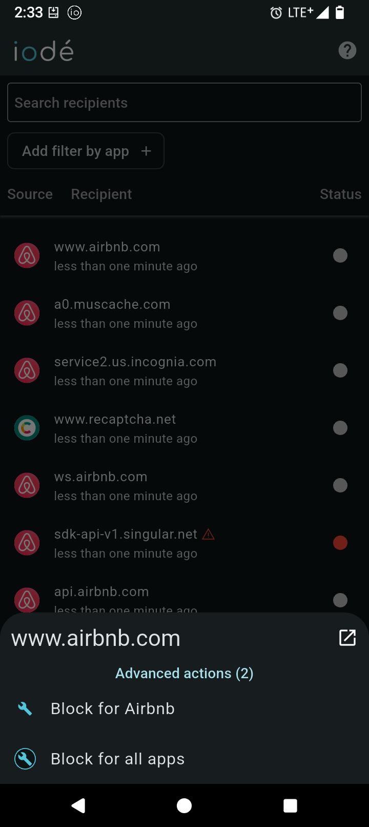 Please go into the iodé app, tap on “Apps under Standard Protection”, then find the AirBnB app and tap the “x” on the “Standard” button. This will remove blocking for it. Then restart the app and check. If this is then working, if you want to re-implement blocking you can re-enable “standard” protection, and back to the main screen of the iodé app you can follow the “Stream” tab, optionally only showing for the app itself, and add individual exceptions for addresses you want to unblock.