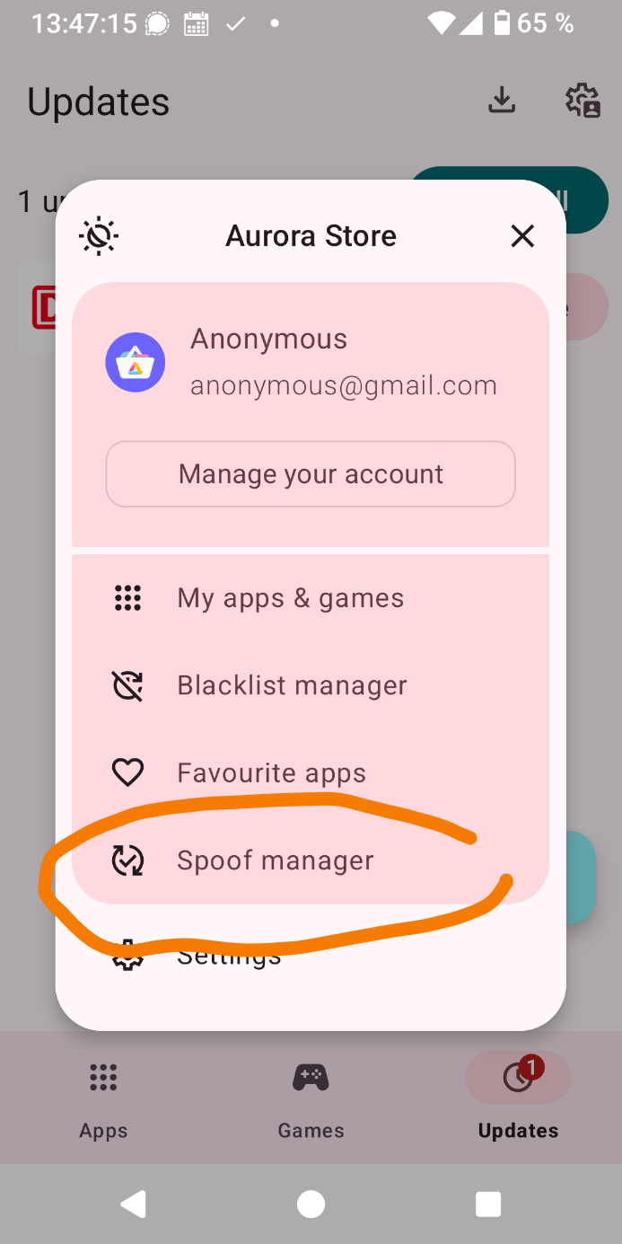 In the Settings, the AuroraStore app is shown as having no blocked permissions.