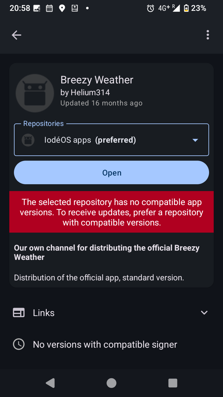 Edit: Fdroid also says something with incompatible all versions. IodeOS repository hasn’t been updated since 13 months, however Fdroid has 3 months ago and IzzyOnDroid even only 13 days ago. Is this maybe related to the issue?