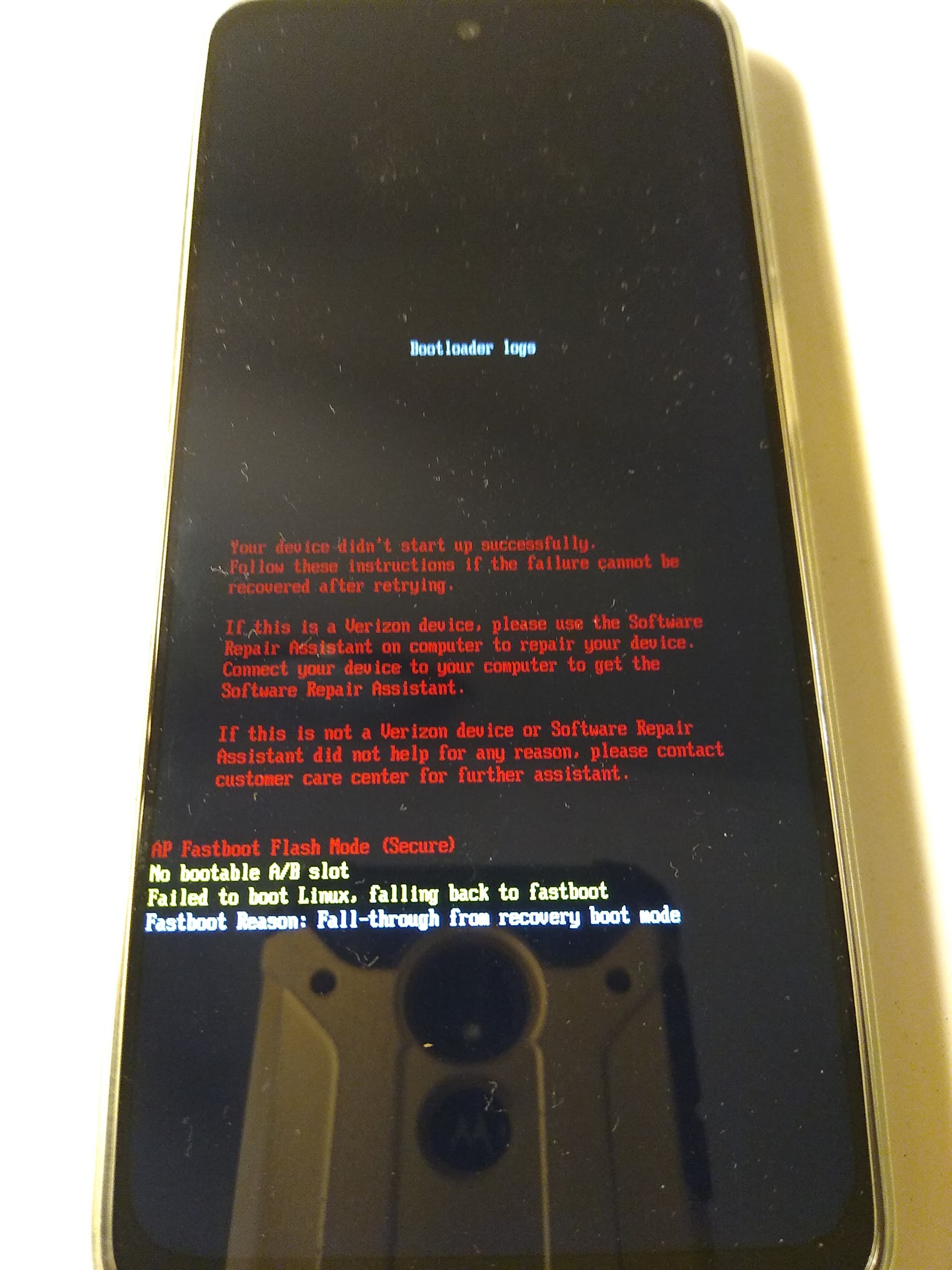 When I power up the phone it goes straight to Bootloader logs in bootloader mode, no error message, no iode display and no motorola display.