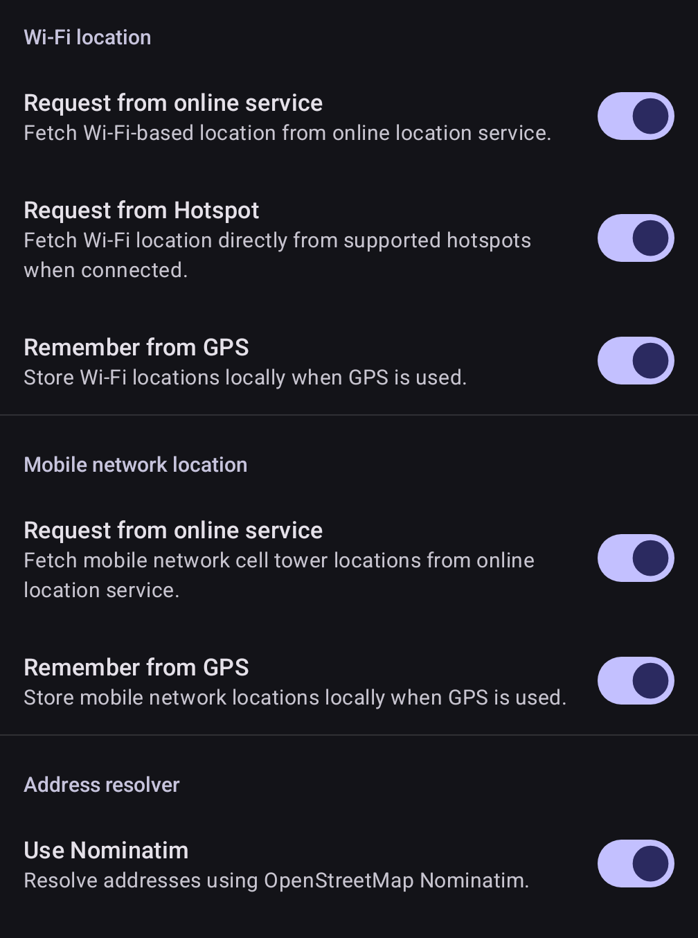 Under microG Location settings, do you have all those toggles on (Remember from GPS, Request from online service, Use Nominatim, etc.)?