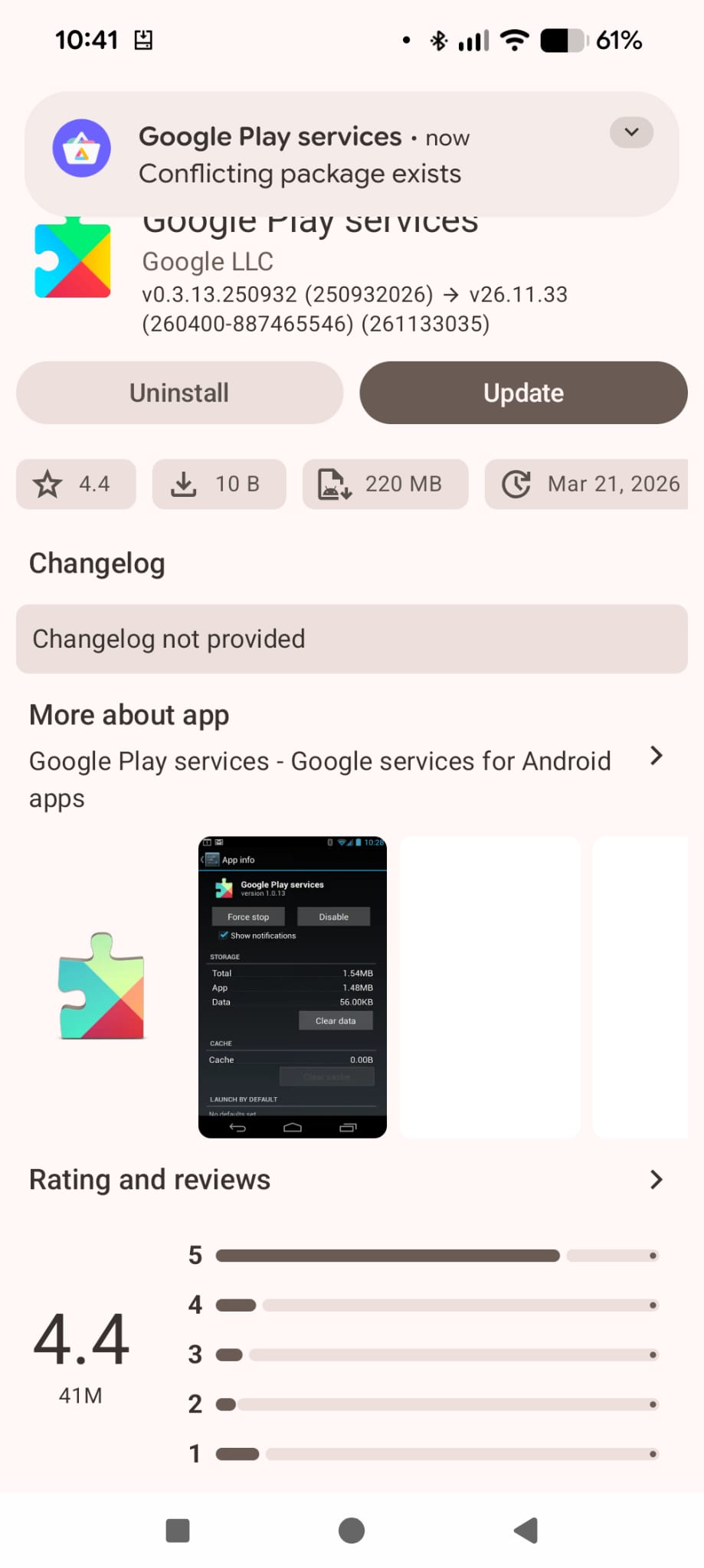 Just prior to updating to Iode 7.4 I got the message Google Play services-conflicting package exists, this is right after downloading an update and trying to install it. (see picture)