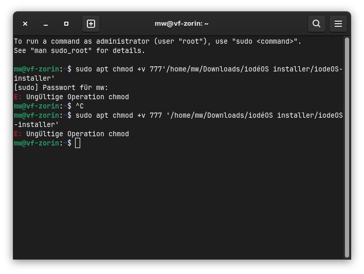 sudo apt chmod +v 777 (hinter 777 ziehst du die Datei “Iode-Installer”) hinterher!