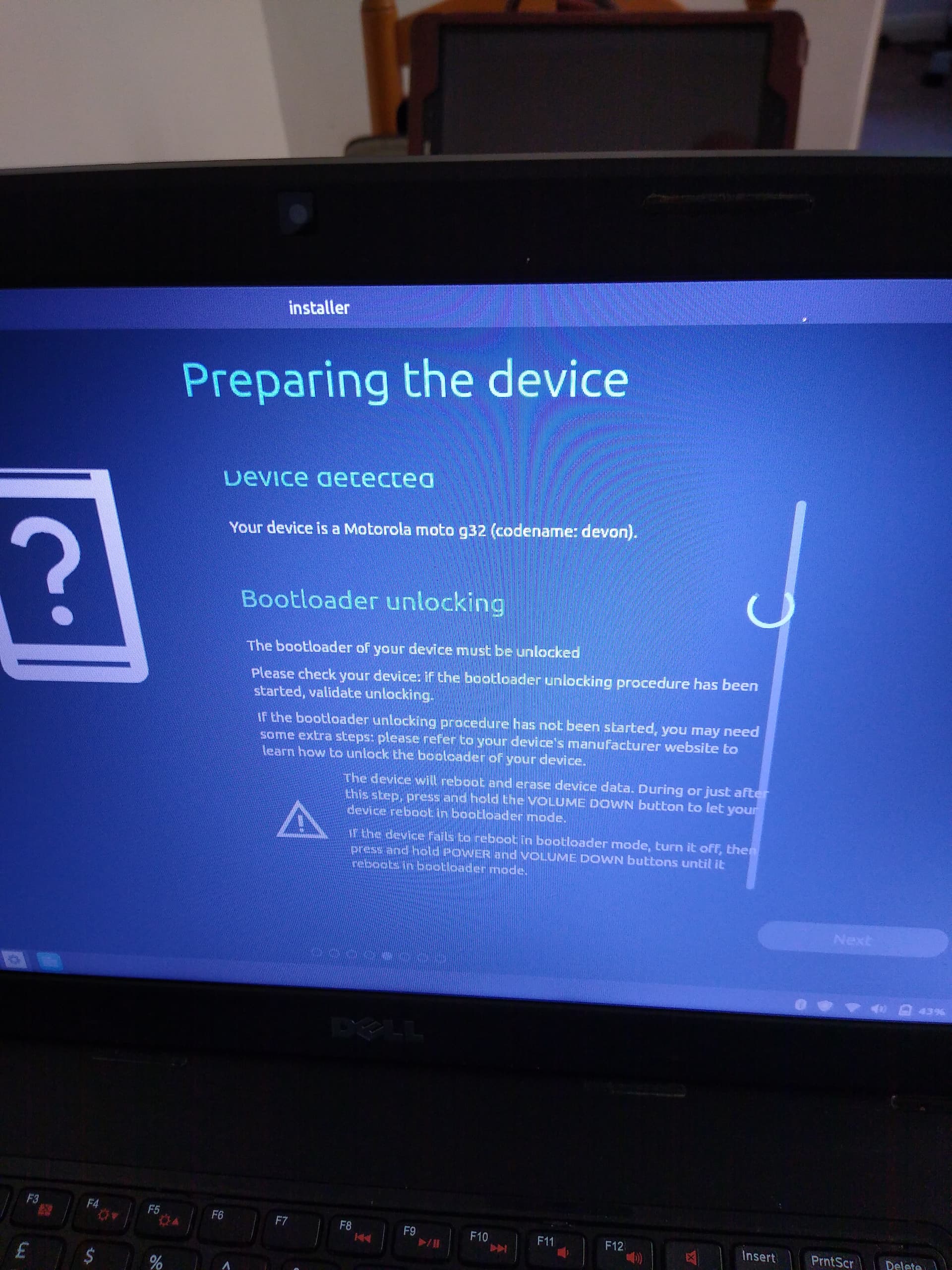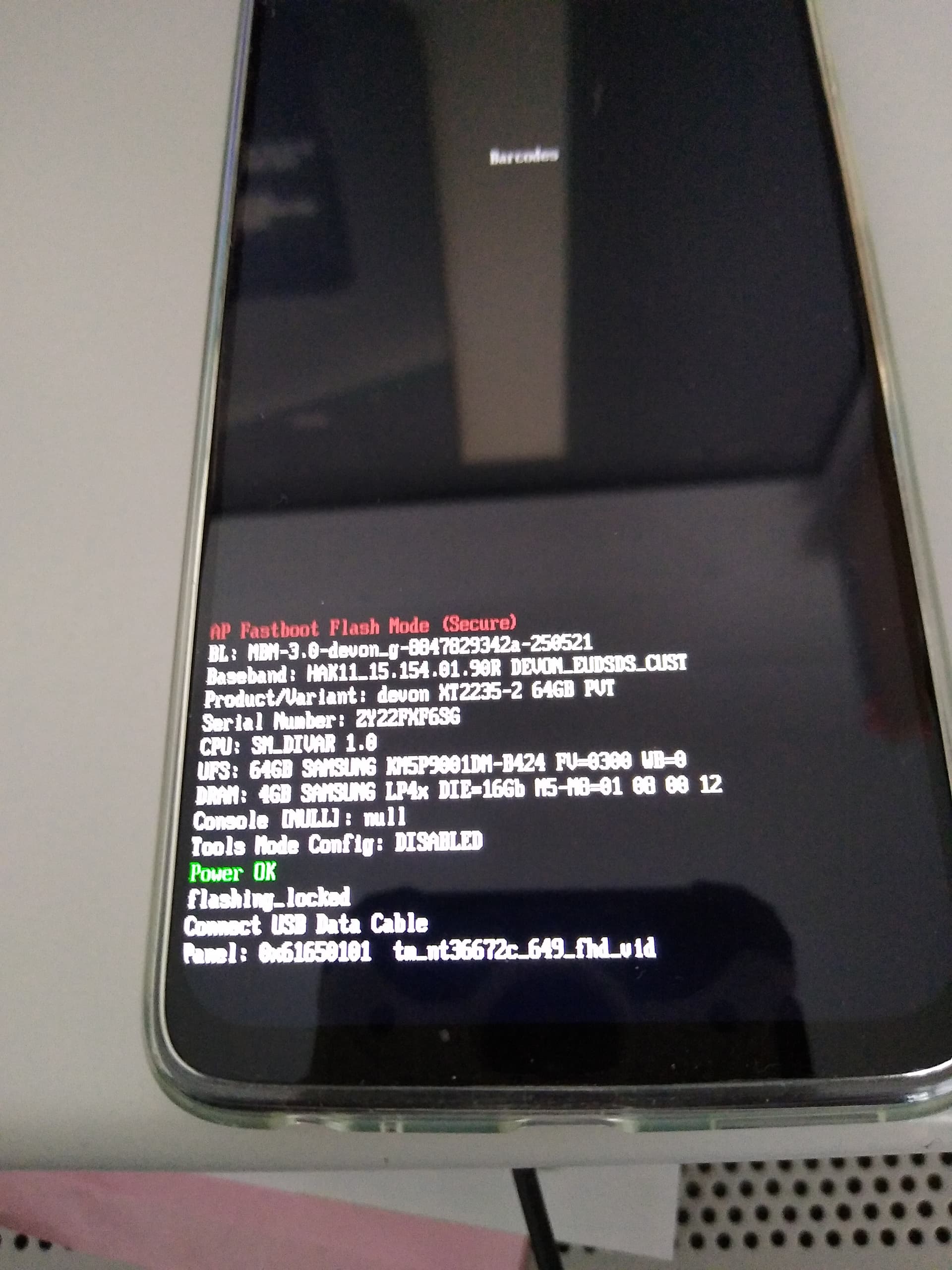 When I boot the device I get the display shown (looks like fastboot mode but different to how it looked previously) and am unable to connect to it using adb. When I try the linux flashing tool it finds the G32 Devon, asks for the unlock code but then I just get the spinning wheel , never unlocks.