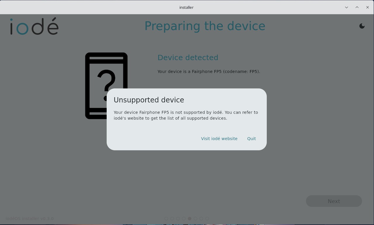 Installer <iodeOS-installer-v0.3.0-linux> meldet nach der Verbindung mit dem Gerät: ‘Erkanntes Gerät FP5 wird nicht unterstützt’