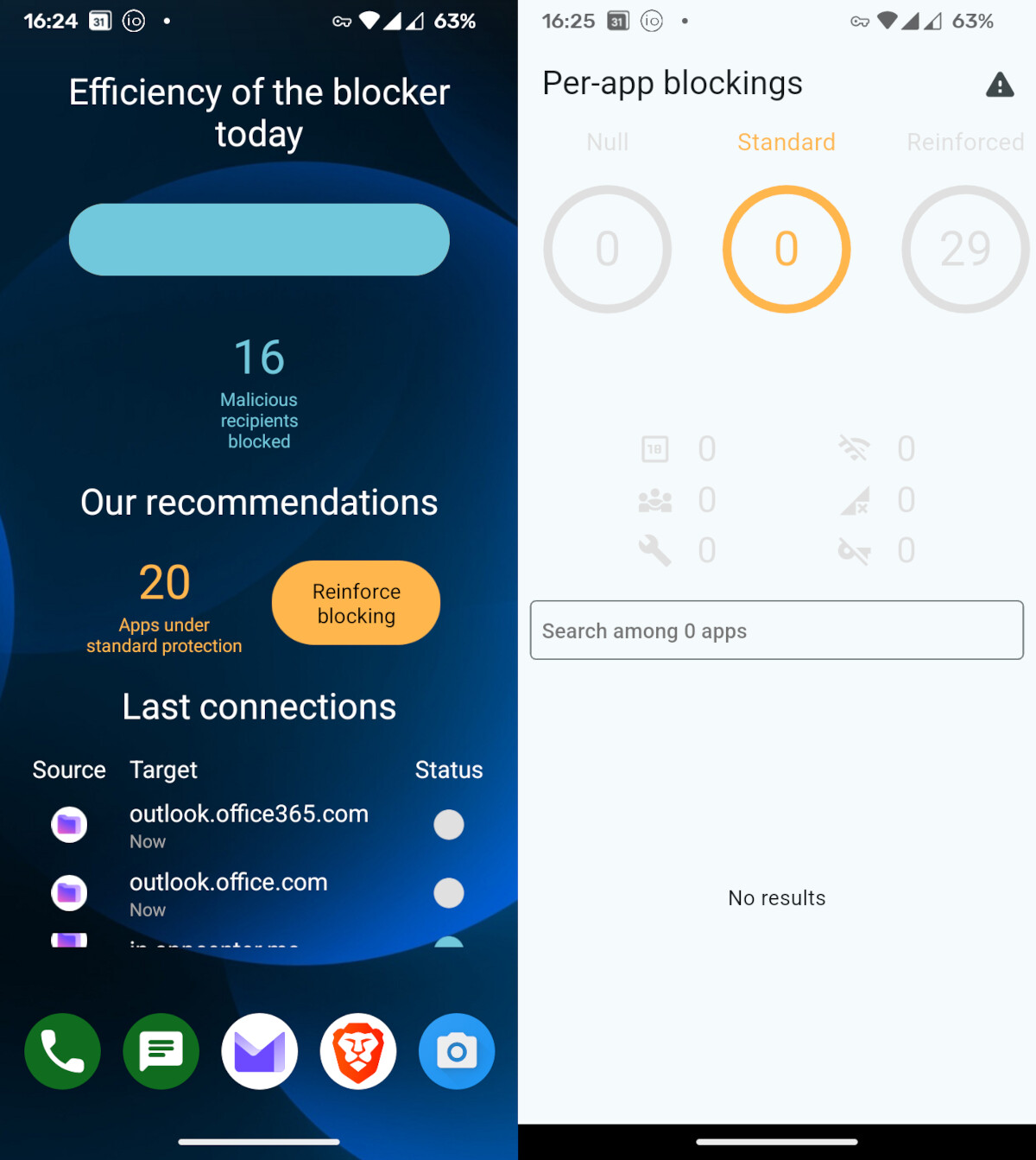 One of the homescreens on my phone has the iodé widget running, which shows me the last connections by apps, but also shows me a bar at the top between “Malicious recipients blocked” (in blue) and “Malicious recipients not blocked” (in orange). The title at the top clearly tells me “Efficiency of the blocker today”. (my emphasis).